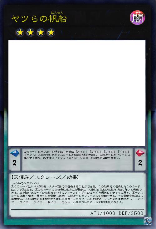 | このカードを用いたP召喚では、自分は「アイツ」「コイツ」「ソイツ」「ドイツ」「ヤツら」と名のついたモンスターしか特殊召喚できない。このカードがPゾーンに存在する限り、相手はメインフェイズ1にモンスターの効果を発動できない。 | |||
