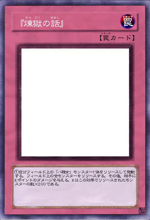 | ①自分フィールド上の「八稚女」モンスター1体をリリースして発動する。フィールド上の全モンスターをリリースする。その後、相手にXポイントのダメージを与える。Xはこの効果でリリースされたモンスターの数×200である。 | |||