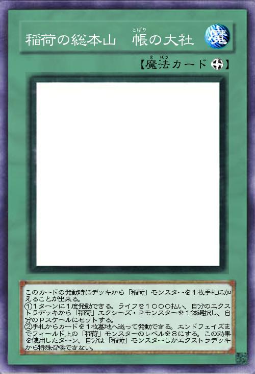 | このカードの発動時にデッキから「稲荷」モンスターを1枚手札に加えることが出来る。 ①1ターンに1度発動できる。ライフを1000払い、自分のエクストラデッキから「稲荷」エクシーズ・Pモンスターを1体選択し、自分のPスケールにセットする。 ②手札からカードを1枚墓地へ送って発動できる。エンドフェイズまでフィールド上の「稲荷」モンスターのレベルを8にする。この効果を使用したターン、自分は「稲荷」モンスターしかエクストラデッキから特殊召喚できない。 | |||