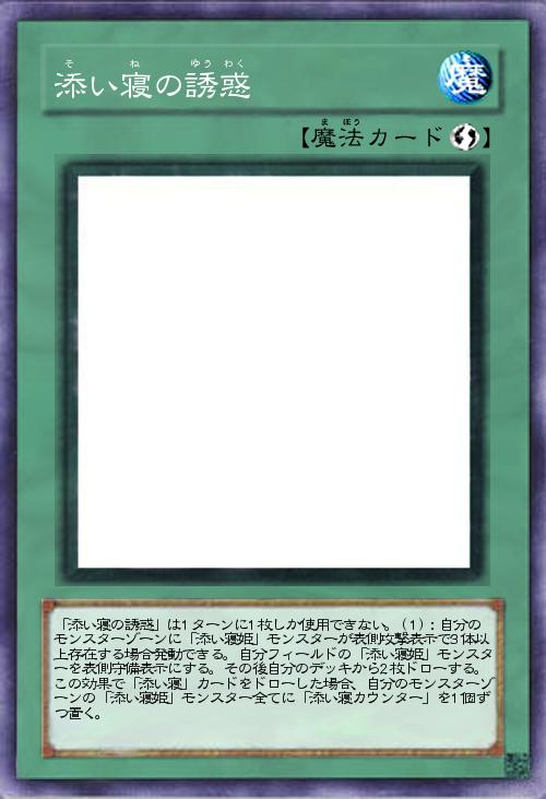 | 「添い寝の誘惑」は1ターンに1枚しか使用できない。(1):自分のモンスターゾーンに「添い寝姫」モンスターが表側攻撃表示で3体以上存在する場合発動できる。自分フィールドの「添い寝姫」モンスターを表側守備表示にする。その後自分のデッキから2枚ドローする。この効果で「添い寝」カードをドローした場合、自分のモンスターゾーンの「添い寝姫」モンスター全てに「添い寝カウンター」を1個ずつ置く。 | |||