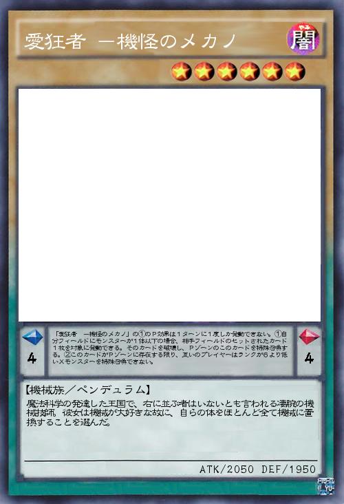 | 「愛狂者 -機怪のメカノ」の①のP効果は1ターンに1度しか発動できない。①自分フィールドにモンスターが1体以下の場合、相手フィールドのセットされたカード1枚を対象に発動できる。そのカードを破壊し、Pゾーンのこのカードを特殊召喚する。②このカードがPゾーンに存在する限り、互いのプレイヤーはランクが6より低いXモンスターを特殊召喚できない。 | |||