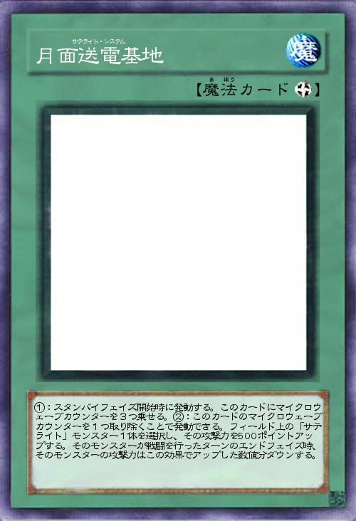 | ①:スタンバイフェイズ開始時に発動する。このカードにマイクロウェーブカウンターを3つ乗せる。②:このカードのマイクロウェーブカウンターを1つ取り除くことで発動できる。フィールド上の「サテライト」モンスター1体を選択し、その攻撃力を500ポイントアップする。そのモンスターが戦闘を行ったターンのエンドフェイズ時、そのモンスターの攻撃力はこの効果でアップした数値分ダウンする。 | |||