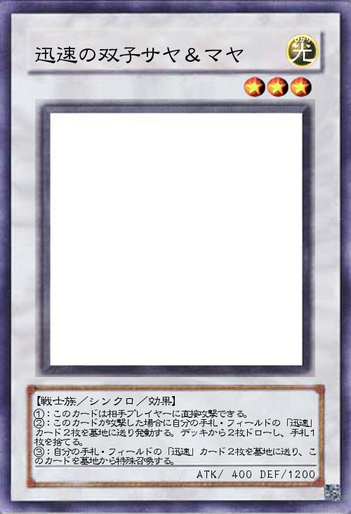 | ①:このカードは相手プレイヤーに直接攻撃できる。 ②:このカードが攻撃した場合に自分の手札・フィールドの「迅速」カード2枚を墓地に送り発動する。デッキから2枚ドローし、手札1枚を捨てる。 ③:自分の手札・フィールドの「迅速」カード2枚を墓地に送り、このカードを墓地から特殊召喚する。 | |||