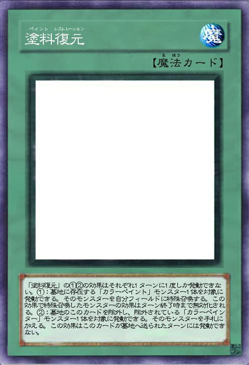 | 「塗料復元」の①②の効果はそれぞれ1ターンに1度しか発動できない。①:墓地に存在する「カラーペイント」モンスター1体を対象に発動できる。そのモンスターを自分フィールドに特殊召喚する。この効果で特殊召喚したモンスターの効果はターン終了時まで無効化される。②:墓地のこのカードを除外し、除外されている「カラーペインター」モンスター1体を対象に発動できる。そのモンスターを手札に加える。この効果はこのカードが墓地へ送られたターンには発動できない。 | |||
