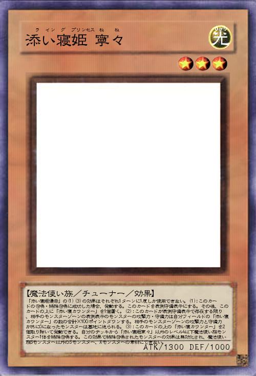 | 「添い寝姫優奈」の(1)(3)の効果はそれぞれ1ターンに1度しか使用できない。(1):このカードの召喚・特殊召喚に成功した場合、発動する。このカードを表側守備表示にする。その後、このカードの上に「添い寝カウンター」を1個置く。(2):このカードが表側守備表示で存在する限り、相手のモンスターゾーンの表側表示のモンスターの攻撃力・守備力は自分フィールドの「添い寝カウンター」の数の合計×100ポイントダウンする。相手のモンスターゾーンの攻撃力と守備力が共に0になったモンスターは墓地に送られる。(3):このカードの上の「添い寝カウンター」を2個取り除いて発動できる。自分のデッキから「添い寝姫寧々」以外のレベル4以下魔法使い族モンスター1体を特殊召喚する。この効果で特殊召喚されたモンスターの効果は無効化され、魔法使い族Sモンスター以外のSモンスター、Xモンスターの素材にできない。 | |||