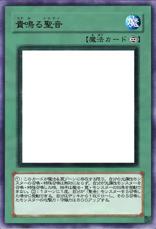 | ①:このカードが魔法&罠ゾーンに存在する限り、自分の光属性モンスターの召喚・特殊召喚は無効にならず、自分が光属性モンスターを召喚・特殊召喚した時、相手は魔法・罠・モンスターの効果を発動できない。②:1ターンに1度、自分が「聖音」モンスターをS召喚した場合に発動できる。自分はデッキから1枚ドローし、そのS召喚したモンスターの攻撃力・守備力は800アップする。 | |||