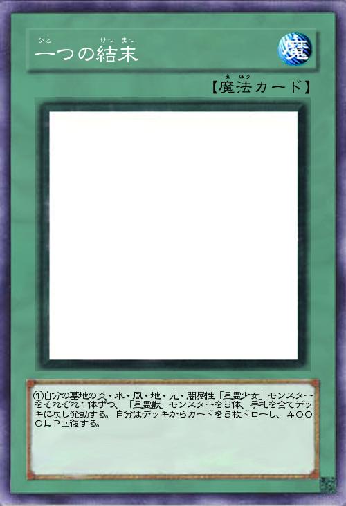 | ①自分の墓地の炎・水・風・地・光・闇属性「星霊少女」モンスターをそれぞれ1体ずつ、「星霊獣」モンスターを5体、手札を全てデッキに戻し発動する。自分はデッキからカードを5枚ドローし、4000LP回復する。 | |||
