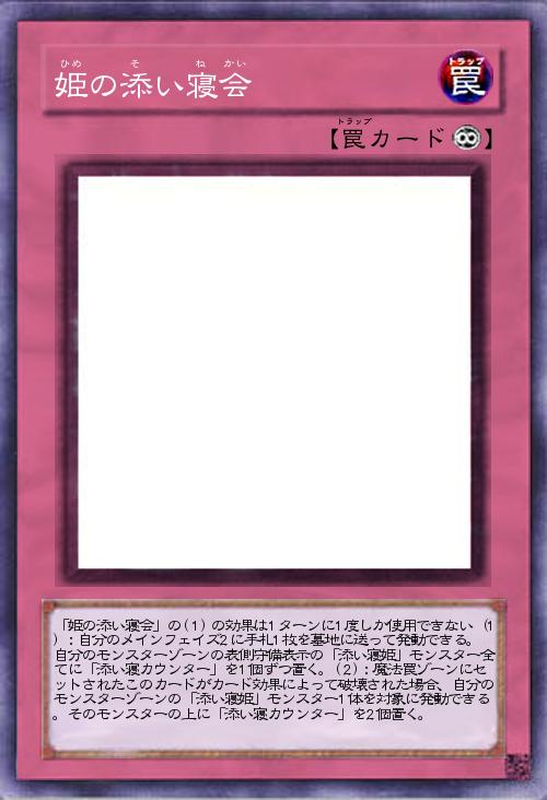 | 「姫の添い寝会」の(1)の効果は1ターンに1度しか使用できない(1):自分のメインフェイズ2に手札1枚を墓地に送って発動できる。自分のモンスターゾーンの表側守備表示の「添い寝姫」モンスター全てに「添い寝カウンター」を1個ずつ置く。(2):魔法罠ゾーンにセットされたこのカードがカード効果によって破壊された場合、自分のモンスターゾーンの「添い寝姫」モンスター1体を対象に発動できる。そのモンスターの上に「添い寝カウンター」を2個置く。 | |||