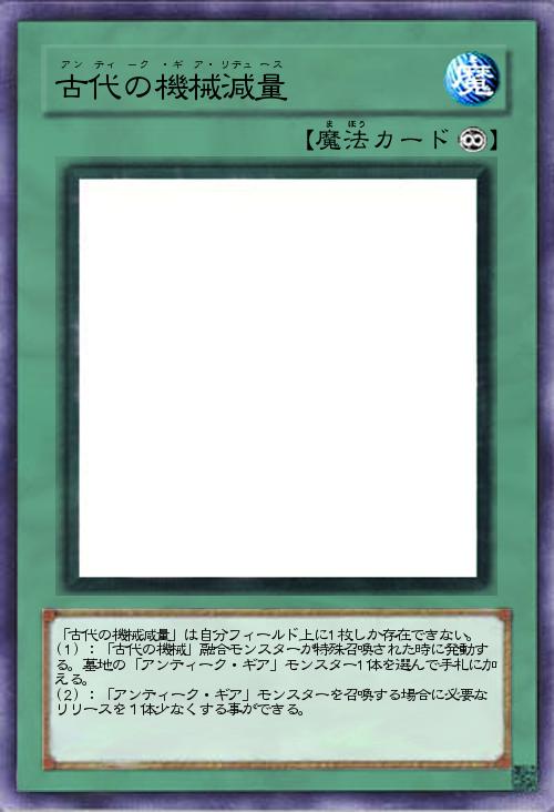 | 「古代の機械減量」は自分フィールド上に1枚しか存在できない。 (1):「古代の機械」融合モンスターが特殊召喚された時に発動する。墓地の「アンティーク・ギア」モンスター1体を選んで手札に加える。 (2):「アンティーク・ギア」モンスターを召喚する場合に必要なリリースを1体少なくする事ができる。 | |||