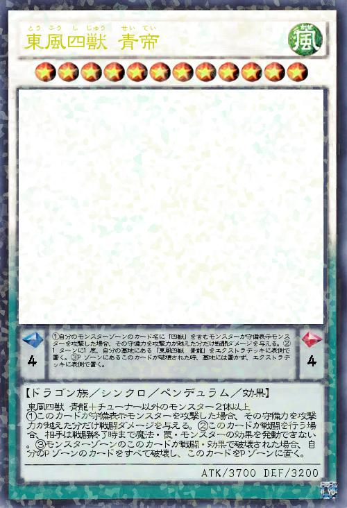 | 東風四獣 青龍+チューナー以外のモンスター2体以上 ①このカードが守備表示モンスターを攻撃した場合、その守備力を攻撃力が越えた分だけ戦闘ダメージを与える。②このカードが戦闘を行う場合、相手は戦闘終了時まで魔法・罠・モンスターの効果を発動できない。③モンスターゾーンのこのカードが戦闘・効果で破壊された場合、自分のPゾーンのカードをすべて破壊し、このカードをPゾーンに置く。 | |||