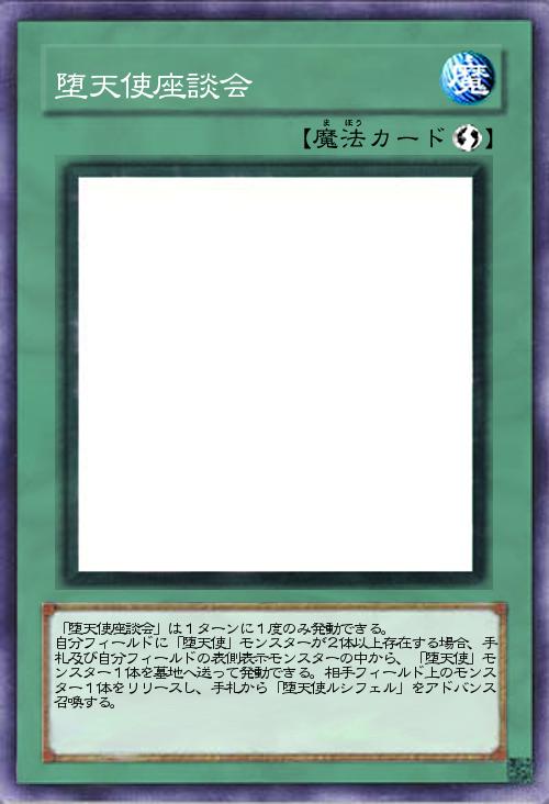 | 「堕天使座談会」は1ターンに1度のみ発動できる。 自分フィールドに「堕天使」モンスターが2体以上存在する場合、手札及び自分フィールドの表側表示モンスターの中から、「堕天使」モンスター1体を墓地へ送って発動できる。相手フィールド上のモンスター1体をリリースし、手札から「堕天使ルシフェル」をアドバンス召喚する。 | |||