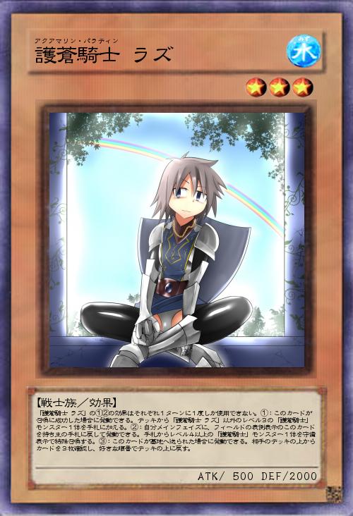 | 「護蒼騎士 ラズ」の①②の効果はそれぞれ1ターンに1度しか使用できない。①:このカードが召喚に成功した場合に発動できる。デッキから「護蒼騎士 ラズ」以外のレベル3の「護蒼騎士」モンスター1体を手札に加える。②:自分メインフェイズに、フィールドの表側表示のこのカードを持ち主の手札に戻して発動できる。手札からレベル4以上の「護蒼騎士」モンスター1体を守備表示で特殊召喚する。③:このカードが墓地へ送られた場合に発動できる。相手のデッキの上からカードを3枚確認し、好きな順番でデッキの上に戻す。 | |||