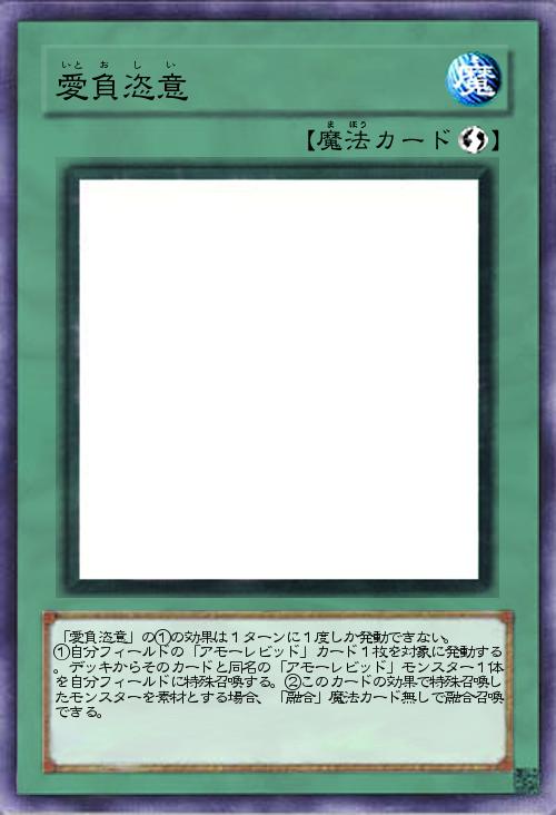 | 「愛負恣意」の①の効果は1ターンに1度しか発動できない。 ①自分フィールドの「アモーレビッド」カード1枚を対象に発動する。デッキからそのカードと同名の「アモーレビッド」モンスター1体を自分フィールドに特殊召喚する。②このカードの効果で特殊召喚したモンスターを素材とする場合、「融合」魔法カード無しで融合召喚できる。 | |||