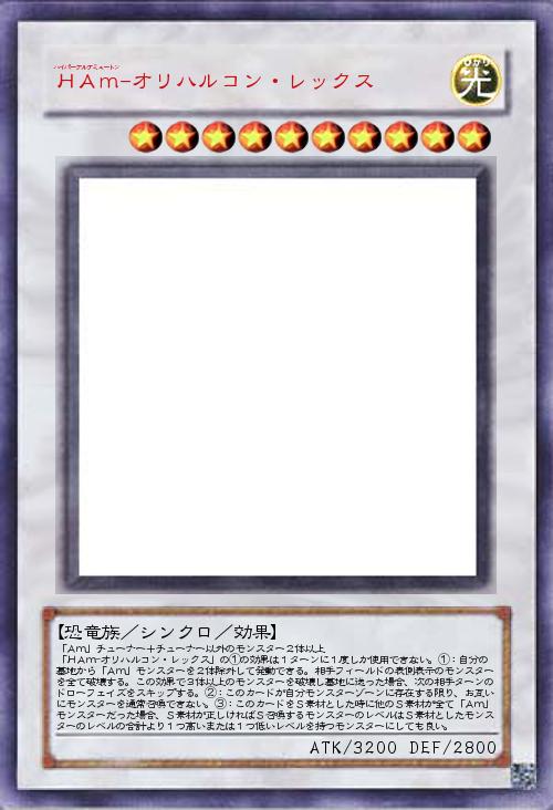 | 「Am」チューナー+チューナー以外のモンスター2体以上 「HAm-オリハルコン・レックス」の①の効果は1ターンに1度しか使用できない。①:自分の墓地から「Am」モンスターを2体除外して発動できる。相手フィールドの表側表示のモンスターを全て破壊する。この効果で3体以上のモンスターを破壊し墓地に送った場合、次の相手ターンのドローフェイズをスキップする。②:このカードが自分モンスターゾーンに存在する限り、お互いにモンスターを通常召喚できない。③:このカードをS素材とした時に他のS素材が全て「Am」モンスターだった場合、S素材が正しければS召喚するモンスターのレベルはS素材としたモンスターのレベルの合計より1つ高いまたは1つ低いレベルを持つモンスターにしても良い。 | |||