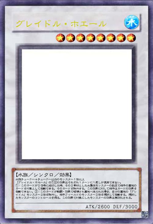 | 水族チューナー+チューナー以外のモンスター1体以上 「グレイドル・ホエール」の①②の効果はそれぞれ1ターンに1度しか使用できない。 ①:このカードがS召喚に成功した時、そのS素材とした水属性モンスターの数まで相手の墓地のカードを対象として発動できる。そのカードを除外する。この効果に対して相手はカードの効果を発動できない。②:このカードが戦闘・効果で破壊され墓地へ送られた場合、自分の墓地の「グレイドル」モンスター2体を除外し、相手フィールドのモンスター2体を選択して発動する。選択したモンスターのコントロールを得る。この効果で対象にしたモンスターの効果は無効化される。 | |||