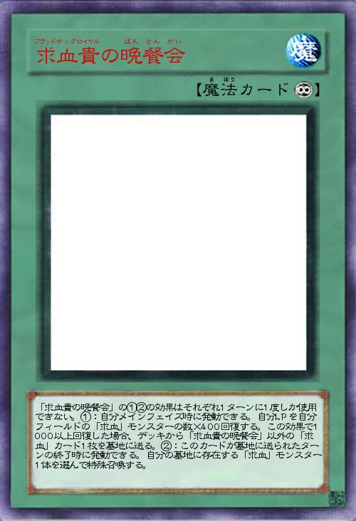 | 「求血貴の晩餐会」の①②の効果はそれぞれ1ターンに1度しか使用できない。①:自分メインフェイズ時に発動できる。自分LPを自分フィールドの「求血」モンスターの数×400回復する。この効果で1000以上回復した場合、デッキから「求血貴の晩餐会」以外の「求血」カード1枚を墓地に送る。②:このカードが墓地に送られたターンの終了時に発動できる。自分の墓地に存在する「求血」モンスター1体を選んで特殊召喚する。 | |||