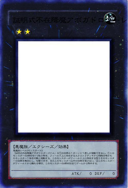 | 悪魔族レベル2モンスター×2 「証明式不在降魔アボガドロガーゴイル」の①の効果は1ターンに1度しか発動できない。①このモンスターのX素材を1つ取り除き、フィールド上に存在するエクストラデッキから特殊召喚されたモンスター1体を対象に発動する。このモンスターがフィールド上に存在する限りそのモンスターの効果を無効にし、攻撃できず、またこのモンスター以外の効果を受けない。②このモンスターがフィールドから離れる場合、このモンスターのX素材は全てゲームから除外する。 | |||