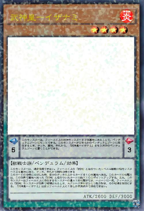 | このモンスターは、フィールド上の武神モンスターを3体墓地に送ることで、ペンデュラムゾーンにセットできる。このモンスターがどちらかのペンデュラムゾーンに存在するとき、デッキ、墓地、手札から、「武神皇ーイザナミ」をもう片方のペンデュラムゾーンに置くことができる。 | |||