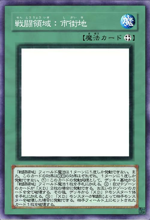 | 「戦闘領域」フィールド魔法は1ターンに1度しか発動できない。また、このカードの効果は②③の効果はぞれぞれ、1ターンに1度しか発動できない。①:このカードの発動処理として、デッキ・墓地から「戦闘領域」フィールド魔法1枚を手札に加える。②:自分Pゾーンのカードが「XD」2枚の場合に発動できる。お互いのPゾーンのカードを全て破壊する。その後、デッキから「XD」Pモンスター1体を手札に加える。③:「XD」モンスターが戦闘によって相手モンスターを破壊した場合に発動できる。相手フィールド上にセットされたカード1枚を破壊する。 | |||