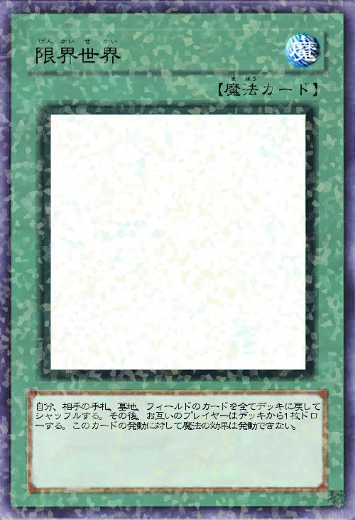 | 自分、相手の手札、墓地、フィールドのカードを全てデッキに戻してシャッフルする。その後、お互いのプレイヤーはデッキから1枚ドローする。このカードの発動に対して魔法の効果は発動できない。 | |||