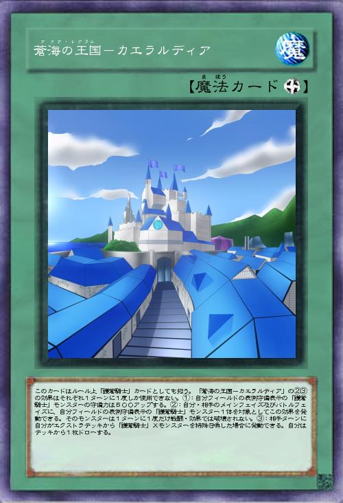 | このカードはルール上「護蒼騎士」カードとしても扱う。「蒼海の王国-カエラルディア」の②③の効果はそれぞれ1ターンに1度しか使用できない。①:自分フィールドの表側守備表示の「護蒼騎士」モンスターの守備力は500アップする。②:自分・相手のメインフェイズ及びバトルフェイズに、自分フィールドの表側守備表示の「護蒼騎士」モンスター1体を対象としてこの効果を発動できる。そのモンスターは1ターンに1度だけ戦闘・効果では破壊されない。③:相手ターンに自分がエクストラデッキから「護蒼騎士」Xモンスターを特殊召喚した場合に発動できる。自分はデッキから1枚ドローする。 | |||