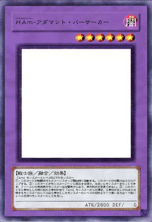 | 「Am」モンスター+レベル6以下のモンスター ①:このカードが戦闘を行うダメージステップ開始時に発動する。このカードの攻撃力は200アップする。②:このカードがモンスターゾーンに存在する限り、お互いにモンスターをセットできず、フィールドの表側表示モンスターは攻撃表示になり、表示形式を変更できない。③:このカードをS素材とした時に他のS素材が全て「Am」モンスターだった場合、S素材が正しければS召喚するモンスターのレベルはS素材としたモンスターのレベルの合計より1つ高いまたは1つ低いレベルを持つモンスターにしても良い。 | |||
