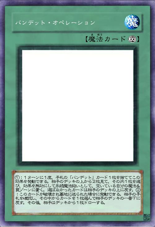| ①:1ターンに1度、手札の「バンデット」カード1枚を捨ててこの効果を発動できる。相手のデッキの上から2枚見て、その内1枚を選び、効果を無効にして永続魔法扱いとして、空いている自分の魔法&罠ゾーンに置く。選ばなかったカードは相手のデッキの上に戻す。②:このカードが破壊され墓地に送られた場合に発動できる。相手の手札を確認し、その中からカードを1枚選んで相手のデッキの一番下に戻す。その後、相手はデッキから1枚ドローする。 | |||