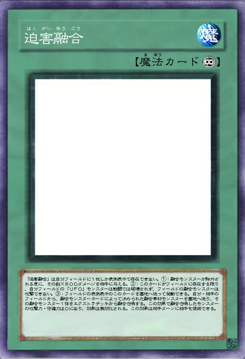 | 「迫害融合」は自分フィールドに1枚しか表側表示で存在できない。①:融合モンスターが除外される度に、その数×500ダメージを相手に与える。②:このカードがフィールドに存在する限り、自分フィールドの「UFO」モンスターは戦闘では破壊されず、フィールドの融合モンスターは攻撃できない。③:フィールドの表側表示のこのカードを墓地へ送って発動できる。自分・相手のフィールドから、融合モンスターカードによって決められた融合素材モンスターを墓地へ送り、その融合モンスター1体をエクストラデッキから融合召喚する。この効果で融合召喚したモンスターの攻撃力・守備力は0になり、効果は無効化される。この効果は相手ターンに相手も使用できる。 | |||