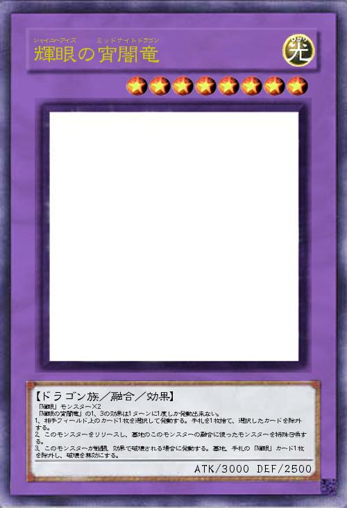 | 「輝眼」モンスター×2 「輝眼の宵闇竜」の1、3の効果は1ターンに1度しか発動出来ない。 1、相手フィールド上のカード1枚を選択して発動する。手札を1枚捨て、選択したカードを除外する。 2、このモンスターをリリースし、墓地のこのモンスターの融合に使ったモンスターを特殊召喚する。 3、このモンスターが戦闘、効果で破壊される場合に発動する。墓地、手札の「輝眼」カード1枚を除外し、破壊を無効にする。 | |||