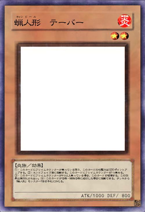 | ①:このカードにフレイムカウンターが乗っている限り、このカードの攻撃力は1200ポイントアップする。②:エンドフェイズ毎に発動する。このカードにフレイムカウンターを1つ乗せる。 ③:このカードにフレイムカウンターが4つ以上乗っている場合、このカードを破壊する。この効果は無効化されない。④:このカードが召喚・特殊召喚に成功した場合に発動できる。デッキから「蝋人形」モンスター1体を手札に加える。 | |||