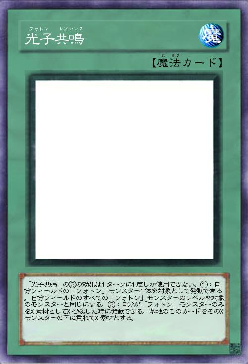 | 「光子共鳴」の②の効果は1ターンに1度しか使用できない。①:自分フィールドの「フォトン」モンスター1体を対象として発動できる。自分フィールドのすべての「フォトン」モンスターのレベルを対象のモンスターと同じにする。②:自分が「フォトン」モンスターのみをX素材としてX召喚した時に発動できる。墓地のこのカードをそのXモンスターの下に重ねてX素材とする。 | |||