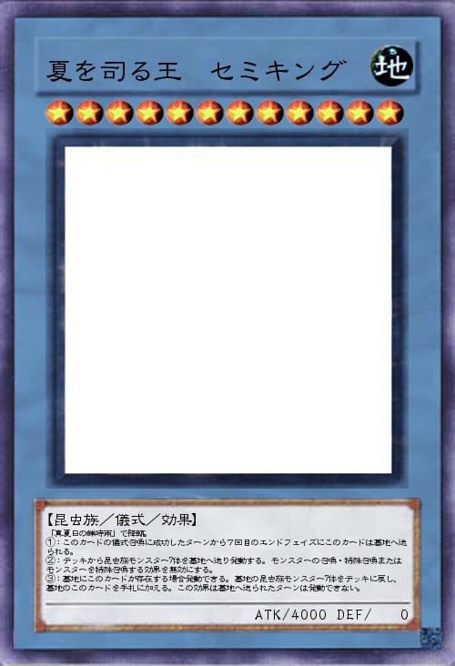 | 「真夏日の蝉時雨」で降臨。 ①:このカードの儀式召喚に成功したターンから7回目のエンドフェイズにこのカードは墓地へ送られる。 ②:デッキから昆虫族モンスター7体を墓地へ送り発動する。モンスターの召喚・特殊召喚またはモンスターを特殊召喚する効果を無効にする。 ③:墓地にこのカードが存在する場合発動できる。墓地の昆虫族モンスター7体をデッキに戻し、墓地のこのカードを手札に加える。この効果は墓地へ送られたターンは発動できない。 | |||