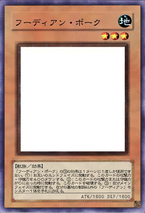 | 「フーディアン・ポーク」の③の効果は1ターンに1度しか使用できない。①:お互いのエンドフェイズに発動する。このカードの攻撃力・守備力を400ダウンする。②:このカードの攻撃力または守備力が0になった時に発動する。このカードを破壊する。③:自分メインフェイズに発動できる。自分の墓地の獣族以外の「フーディアン」モンスター1体を手札に加える。 | |||