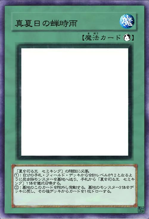 | 「夏を司る王 セミキング」の降臨に必要。 ①:自分の手札・フィールド・デッキから合計レベルが12となるように昆虫族モンスターを墓地へ送り、手札から「夏を司る王 セミキング」1体を儀式召喚する。 ②:墓地のこのカードを除外し発動する。墓地のモンスター3体をデッキに戻し、その後デッキからカードを1枚ドローする。 | |||