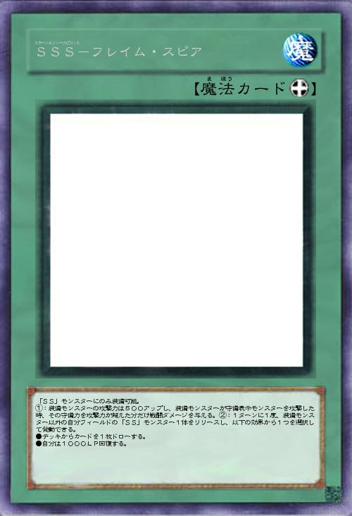 | 「SS」モンスターにのみ装備可能。 ①:装備モンスターの攻撃力は500アップし、装備モンスターが守備表示モンスターを攻撃した時、その守備力を攻撃力が超えた分だけ戦闘ダメージを与える。②:1ターンに1度、装備モンスター以外の自分フィールドの「SS」モンスター1体をリリースし、以下の効果から1つを選択して発動できる。 ●デッキからカードを1枚ドローする。 ●自分は1000LP回復する。 | |||