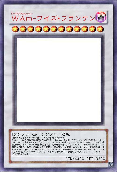 | 属性が異なるチューナー3体+「HAm」モンスター1体 このカードはS召喚でのみ特殊召喚できる。「WAm-ワイズ・フランケン」の③の効果は1ターンに1度しか発動できない。①:モンスターゾーンに存在するこのカードは他のモンスターの効果を受けず、1ターンに1度だけ戦闘によって破壊されない。②:このカードがモンスターゾーンに存在する限り、お互いに発動する通常魔法・速攻魔法・通常罠・カウンター罠カードの効果は「フィールドの表側表示で存在するSモンスターの攻撃力・守備力をターン終了時まで500アップする」になる。③:このカードがフィールドから離れた時に発動する。お互いのフィールドのカードを全て墓地に送る。 | |||