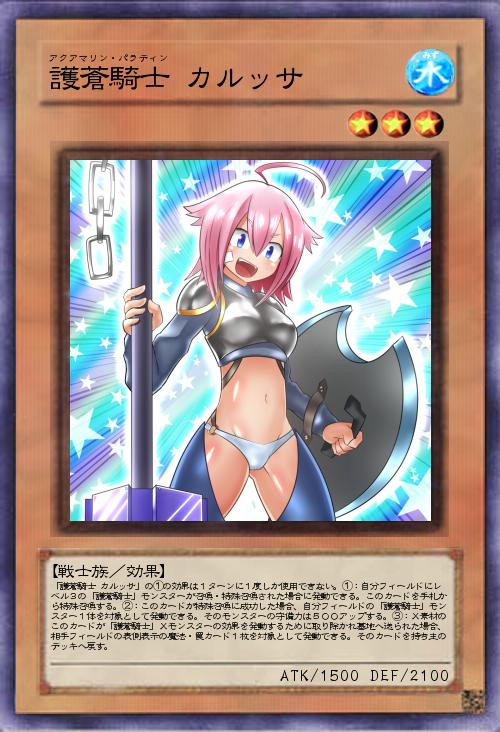 | 「護蒼騎士 カルッサ」の①の効果は1ターンに1度しか使用できない。①:自分フィールドにレベル3の「護蒼騎士」モンスターが召喚・特殊召喚された場合に発動できる。このカードを手札から特殊召喚する。②:このカードが特殊召喚に成功した場合、自分フィールドの「護蒼騎士」モンスター1体を対象として発動できる。そのモンスターの守備力は500アップする。③:X素材のこのカードが「護蒼騎士」Xモンスターの効果を発動するために取り除かれ墓地へ送られた場合、相手フィールドの表側表示の魔法・罠カード1枚を対象として発動できる。そのカードを持ち主のデッキへ戻す。 | |||