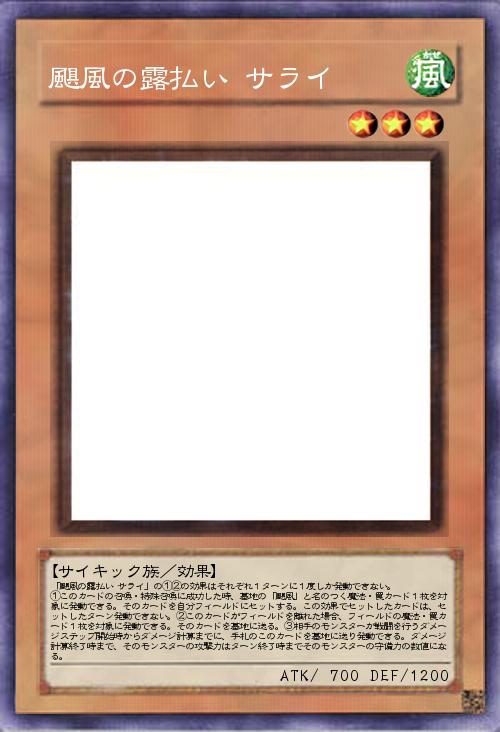 企画段階より大きく弱体化したカード。具体的には、企画段階時には1ターンに1度制限が無かった。ない場合、後々出てくる「墓地に送られた場合、デッキから「颶風」モンスター1体をSSする」カードとオイテ、レベル1チューナー1体の3体とでコンボができてしまう。しかも手札にはオイテとカタバ1体の2枚でコンボになるという。具体的には、2100打点が3体並ぶ+α。流石にやばいということでこのカードとそのカード共々ターン1制限追加。その代わり③の効果を追加。使い道は割とあると思う。