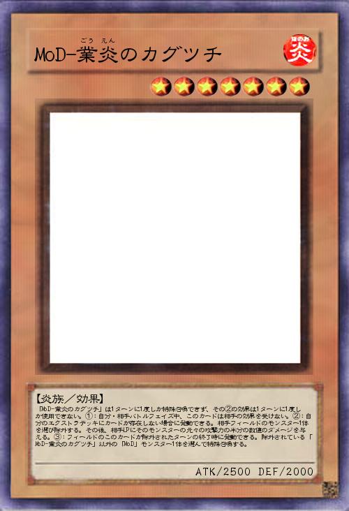 | 「MoD-業炎のカグツチ」は1ターンに1度しか特殊召喚できず、その②の効果は1ターンに1度しか使用できない。①:自分・相手バトルフェイズ中、このカードは相手の効果を受けない。②:自分のエクストラデッキにカードが存在しない場合に発動できる。相手フィールドのモンスター1体を選び除外する。その後、相手LPにそのモンスターの元々の攻撃力の半分の数値のダメージを与える。③:フィールドのこのカードが除外されたターンの終了時に発動できる。除外されている「MoD-業炎のカグツチ」以外の「MoD」モンスター1体を選んで特殊召喚する。 | |||