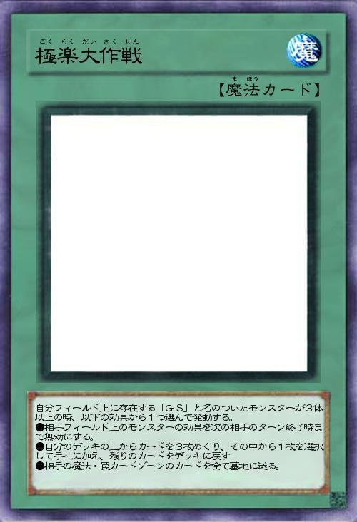 | 自分フィールド上に存在する「G(ゴースト)S(スイーパ)(ー)」と名のついたモンスターが3体以上の時、以下の効果から1つ選んで発動する。 ●相手フィールド上のモンスターの効果を次の相手のターン終了時まで無効にする。 ●自分のデッキの上からカードを3枚めくり、その中から1枚を選択して手札に加え、残りのカードをデッキに戻す ●相手の魔法・罠カードゾーンのカードを全て墓地に送る。 | |||