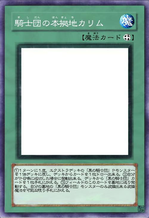 | ①1ターンに1度、エクストラデッキの「黒の騎士団」Pモンスターを1体デッキに戻し、デッキからカードを1枚ドロー出来る。②自分がP召喚に成功した場合に発動出来る。デッキから「黒の騎士団」カードを1枚手札に加える。③フィールドのこのカードを墓地に送り発動する。自分の墓地の「黒の騎士団」モンスターのみ装備出来る装備魔法を可能な限り手札に加える。 | |||