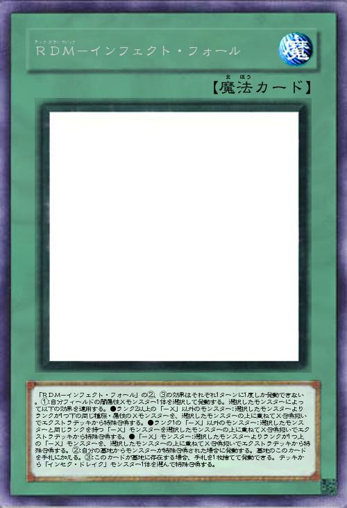 | 「RDM-インフェクト・フォール」の②、③の効果はそれぞれ1ターンに1度しか発動できない。①:自分フィールドの闇属性Xモンスター1体を選択して発動する。選択したモンスターによって以下の効果を適用する。●ランク2以上の「-X」以外のモンスター:選択したモンスターよりランクが1つ下の同じ種族・属性のXモンスターを、選択したモンスターの上に重ねてX召喚扱いでエクストラデッキから特殊召喚する。●ランク1の「-X」以外のモンスター:選択したモンスターと同じランクを持つ「-X」モンスターを選択したモンスターの上に重ねてX召喚扱いでエクストラデッキから特殊召喚する。●「-X」モンスター:選択したモンスターよりランクが1つ上の「-X」モンスターを、選択したモンスターの上に重ねてX召喚扱いでエクストラデッキから特殊召喚する。②:自分の墓地からモンスターが特殊召喚された場合に発動する。墓地のこのカードを手札に | |||