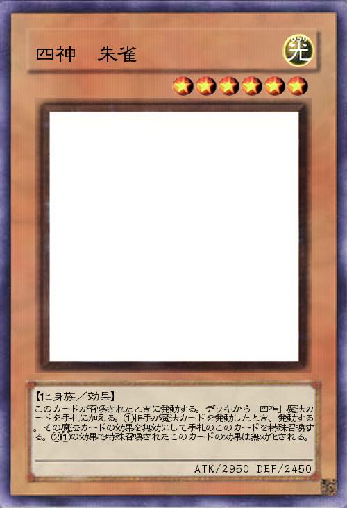 | このカードが召喚されたときに発動する。デッキから「四神」魔法カードを手札に加える。①相手が魔法カードを発動したとき、発動する。その魔法カードの効果を無効にして手札のこのカードを特殊召喚する。②①の効果で特殊召喚されたこのカードの効果は無効化される。 | |||