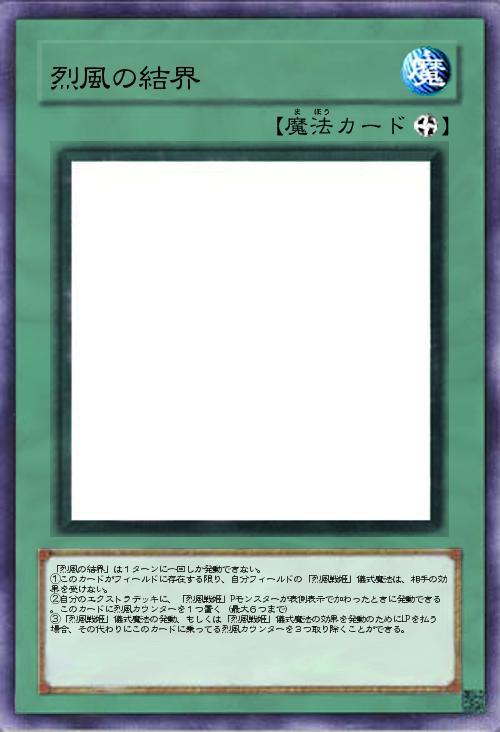 | 「烈風の結界」は1ターンに一回しか発動できない。 ①このカードがフィールドに存在する限り、自分フィールドの「烈風戦姫」儀式魔法は、相手の効果を受けない。 ②自分のエクストラデッキに、「烈風戦姫」Pモンスターが表側表示で加わったときに発動できる。このカードに烈風カウンターを1つ置く(最大6つまで) ③「烈風戦姫」儀式魔法の発動、もしくは「烈風戦姫」儀式魔法の効果を発動のためにLPを払う場合、その代わりにこのカードに乗ってる烈風カウンターを3つ取り除くことができる。 | |||