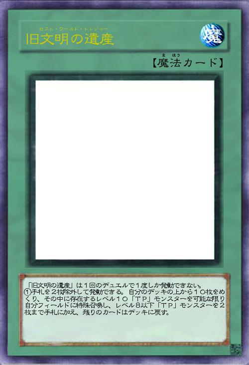 | 「旧文明の遺産」は1回のデュエルで1度しか発動できない。 ①手札を2枚除外して発動できる。自分のデッキの上から10枚をめくり、その中に存在するレベル10「TP」モンスターを可能な限り自分フィールドに特殊召喚し、レベル8以下「TP」モンスターを2枚まで手札に加え、残りのカードはデッキに戻す。 | |||