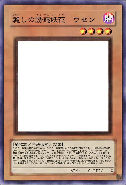 | このカードは通常召喚できない。このカードは墓地からのみ特殊召喚できる。「麗しの誘惑妖花 ウセン」の(1)(3)の効果は1ターンに1度いずれか1つしか使用できない。(1):このカードが墓地に存在する場合自分のメインフェイズ2に1000LP払って発動できる。このカードを自分フィールドに特殊召喚する。(2):このカードがモンスターゾーンに存在する限り、このカードの攻撃力守備力は自分フィールドの「妖花カウンター」の数の合計×200ポイントになる。(3):このカード以外の自分フィールドの「誘惑妖花」モンスター1体を対象にして発動できる。そのモンスターを破壊する。その後、自分のデッキから闇属性・植物族モンスター1体を墓地に送る。 | |||