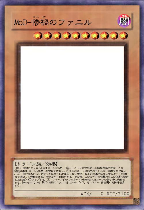 | 「MoD-惨禍のファニル」は1ターンに1度、「MoD」カードの効果でしか特殊召喚できず、その②の効果は1ターンに1度しか使用できない。①:このカードは相手のモンスター効果を受けない。②:自分のエクストラデッキにカードが存在しない場合、お互いの墓地に存在するカードを5枚まで選択して発動できる。そのカードを除外する。その後、このカードの攻撃力をこの効果で除外した枚数×400アップする。③:フィールドのこのカードが除外されたターンの終了時に発動できる。除外されている「MoD-惨禍のファニル」以外の「MoD」モンスター1体を選んで特殊召喚する。 | |||