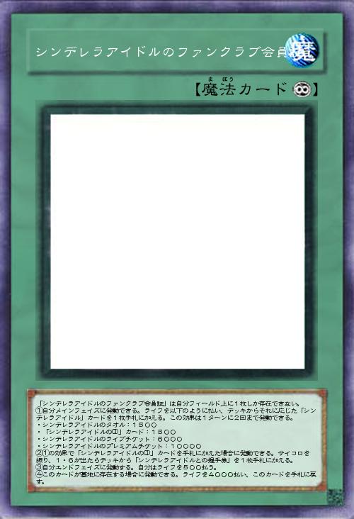 | 「シンデレラアイドルのファンクラブ会員証」は自分フィールド上に1枚しか存在できない。 ①自分メインフェイズに発動できる。ライフを以下のように払い、デッキからそれに応じた「シンデレラアイドル」カードを1枚手札に加える。この効果は1ターンに2回まで発動できる。 ・シンデレラアイドルのタオル:1500 ・「シンデレラアイドルのCD」カード:1500 ・シンデレラアイドルのライブチケット:6000 ・シンデレラアイドルのプレミアムチケット:10000 ②①の効果で「シンデレラアイドルのCD」カードを手札に加えた場合に発動できる。サイコロを振り、1・6が出たらデッキから「シンデレラアイドルとの握手券」を1枚手札に加える。 ③自分エンドフェイズに発動する。自分はライフを500払う。 ④このカードが墓地に存在する場合に発動できる。ライフを4000払い、このカードを手札に戻す。 | |||