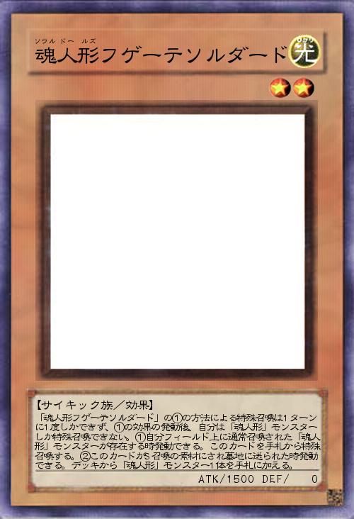| 「魂人形フゲーテソルダード」の①の方法による特殊召喚は1ターンに1度しかできず、①の効果の発動後、自分は「魂人形」モンスターしか特殊召喚できない。①自分フィールド上に通常召喚された「魂人形」モンスターが存在する時発動できる。このカードを手札から特殊召喚する。②このカードがS召喚の素材にされ墓地に送られた時発動できる。デッキから「魂人形」モンスター1体を手札に加える。 | |||