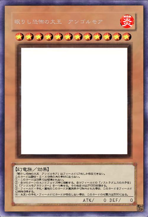 | 「眠りし恐怖の大王 アンゴルモア」はフィールドに1枚しか存在できない。 このカードは融合・S・X召喚の為の素材にならない。 ①:このカードは効果では破壊されない。 ②:自分のターンのエンドフェイズ時に発動する。自分フィールドの「ノストラダムスの大予言」に「アンゴルモアカウンター」を一つ乗せる。その後自分はLP1000回復する。 ③:フィールド・手札・墓地のこのカードが裏側表示で除外された場合、このカードをフィールドに特殊召喚する。 ④:お互いの手札・フィールドにカードが存在しない場合、このカードの攻撃力は5000になる。 | |||